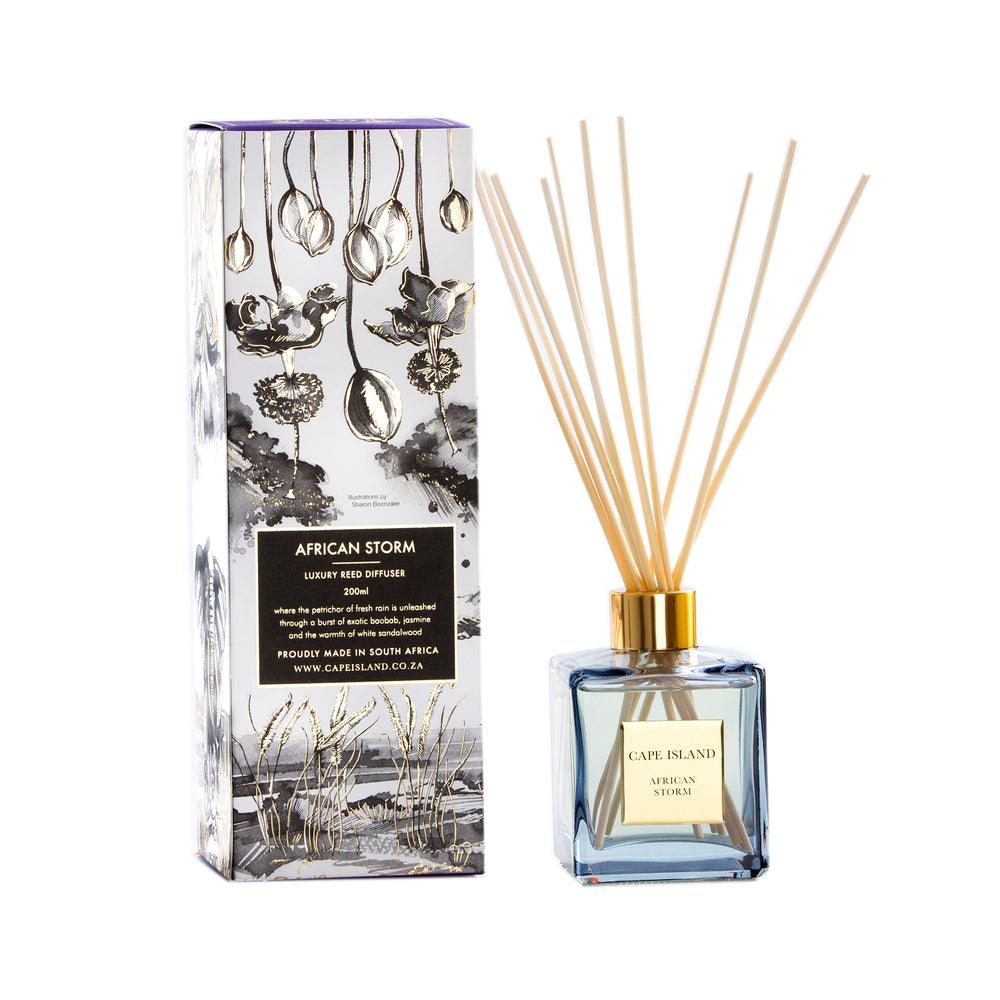 AFRICAN STORM namų kvapas pateikiamas prabangioje dovanų pakuotėje, padabintoje aukso folija ir talentingosios menininkės Sharon Boonzaier iliustracijomis. Šios dailininkės studijoje, įsikūrusioje Pietų Afrikoje, gimsta nepaprasto grožio meno kūriniai, pasakojantys didingo žemyno istorijas.